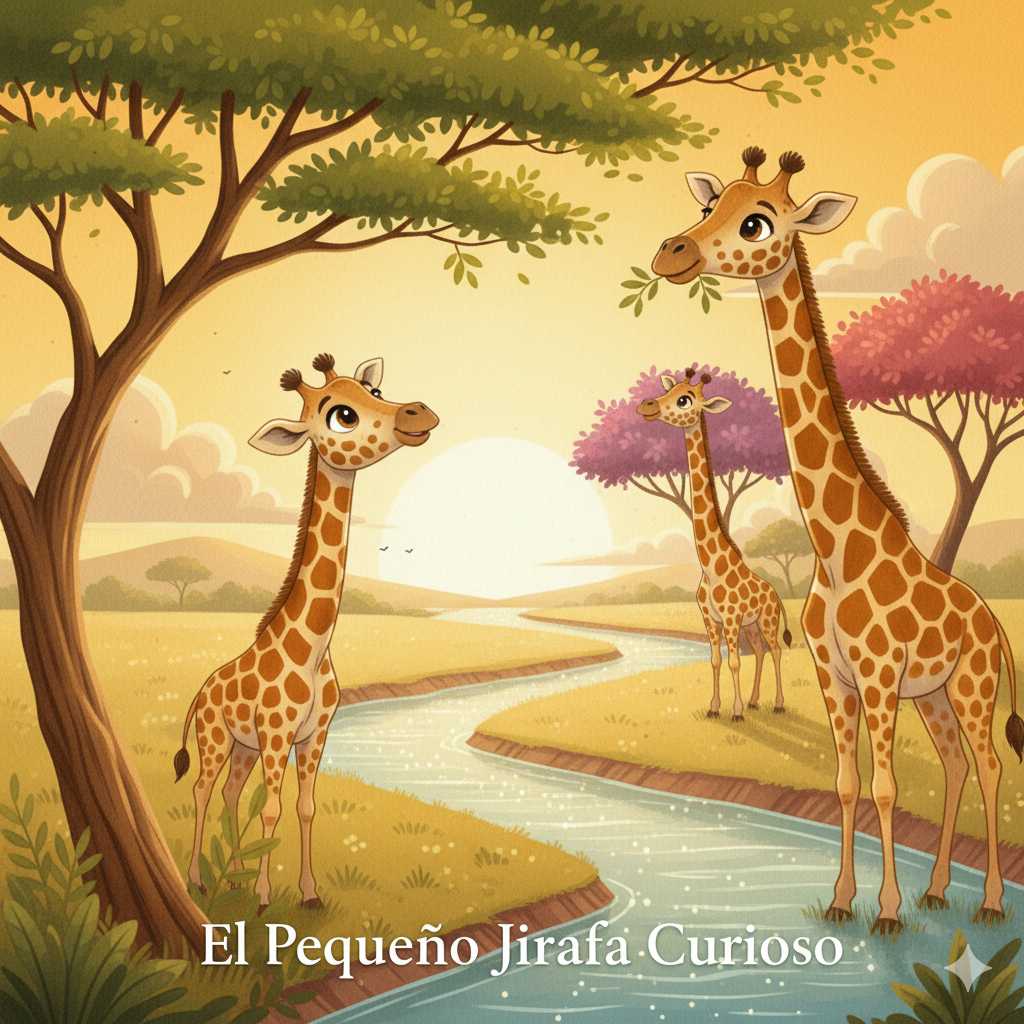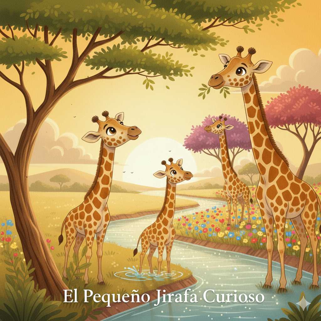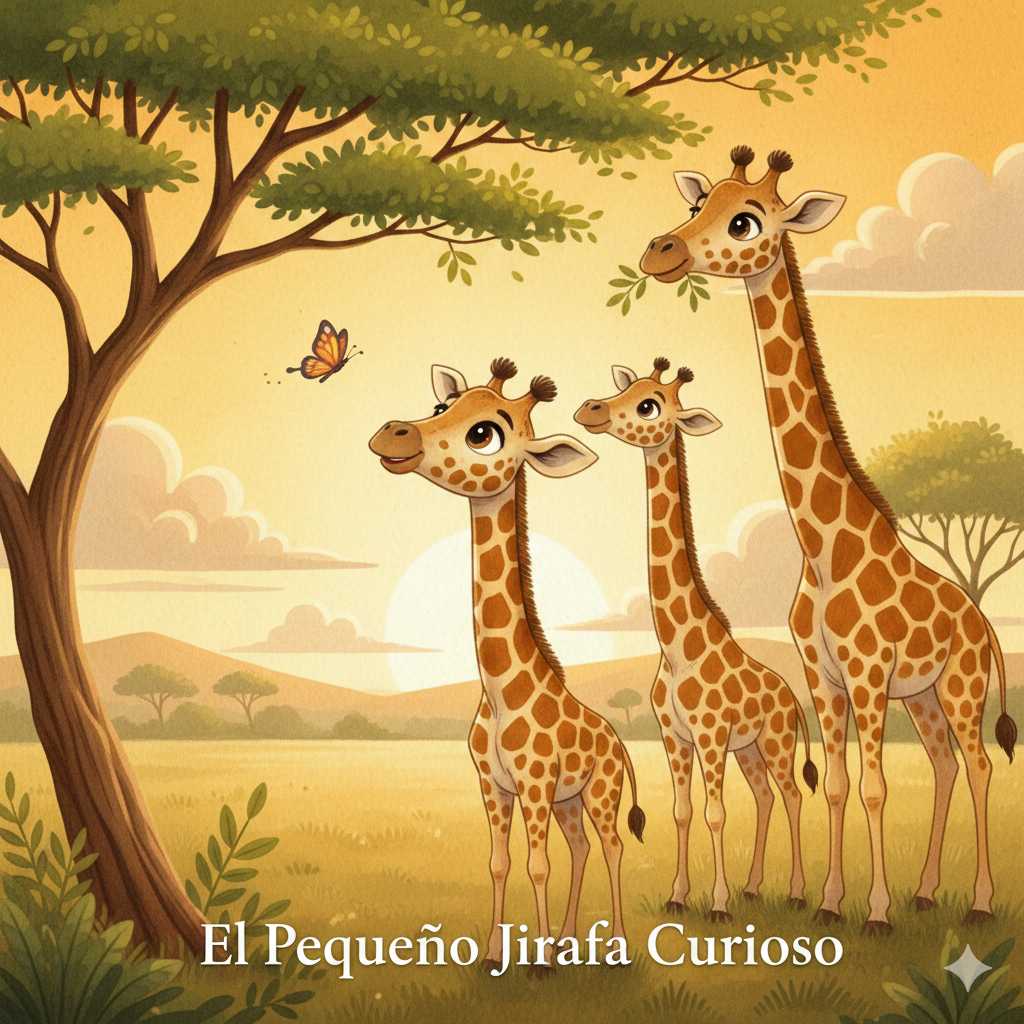 Gira, el pequeño jirafa, junto a sus hermanos y su mamá, observan la sabana al atardecer. Gira tiene una mariposa posada cerca de su cabeza, mostrando su curiosidad.